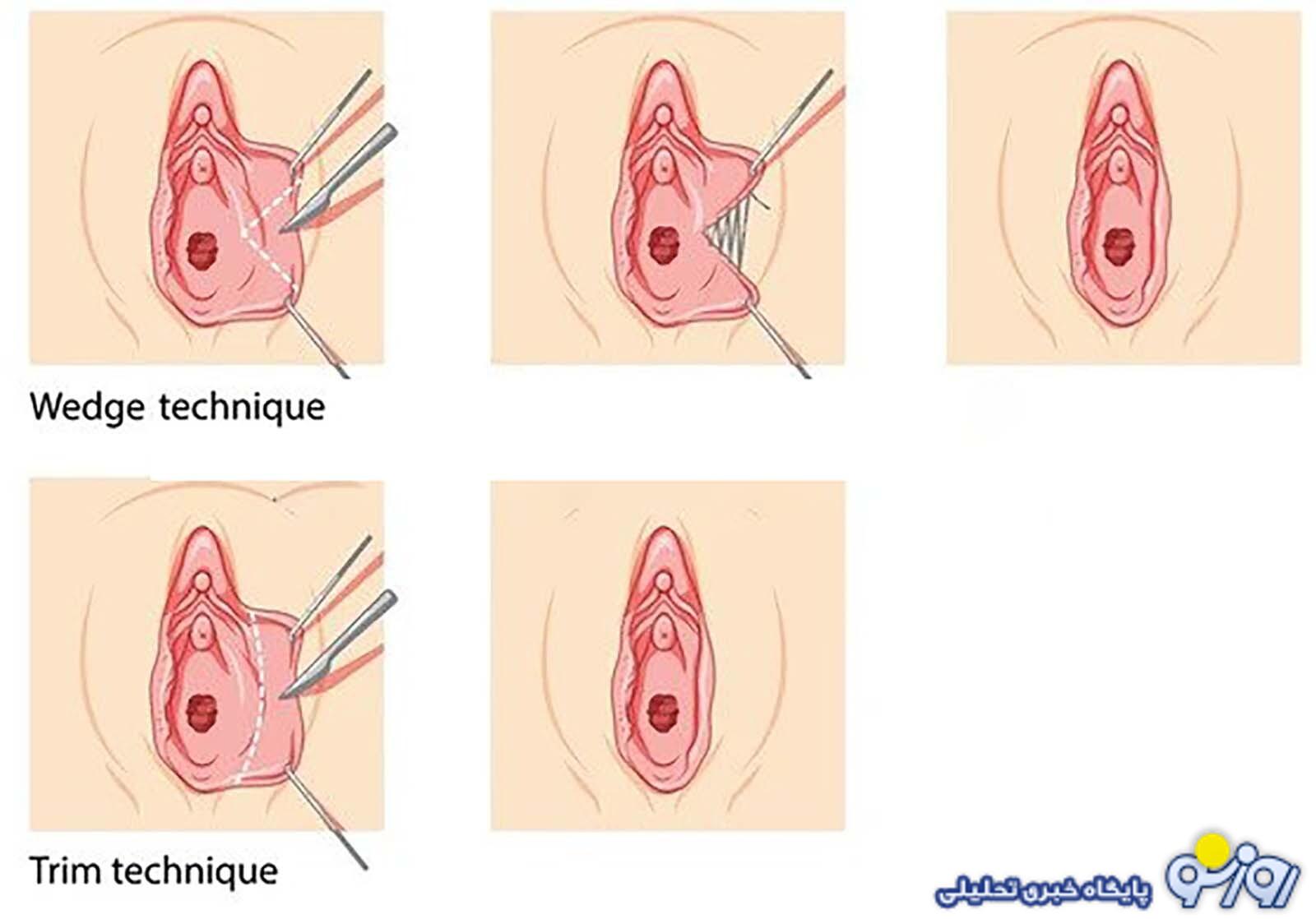- روش چینخوردن(Wedge Technique): در این روش، یک مثلث کوچک از بافت لابیا برداشته میشود و دو سمت آن به هم دوخته میشوند. این روش تقارن طبیعیتری ایجاد میکند و خط جراحی کمتر دیده میشود.